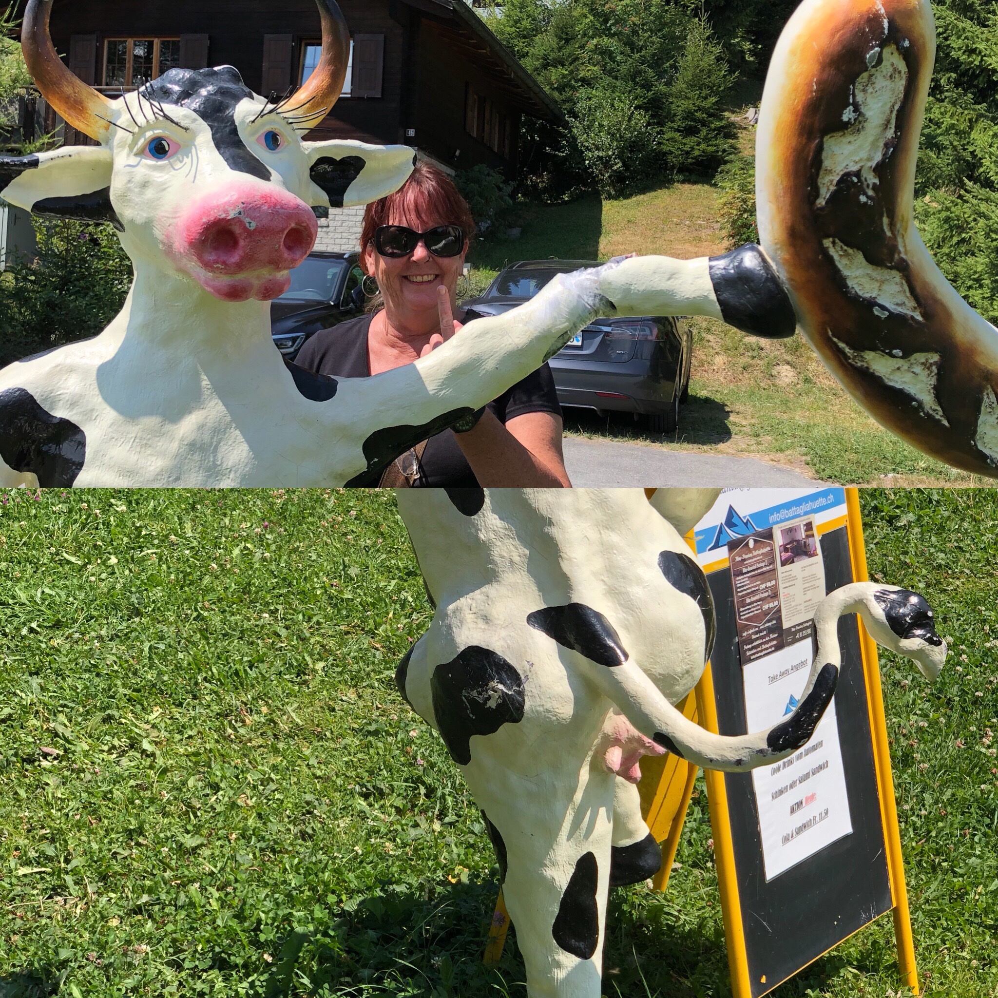 This cow is holding either a baguette or a sausage and has an udder pointing in a slightly strange position.