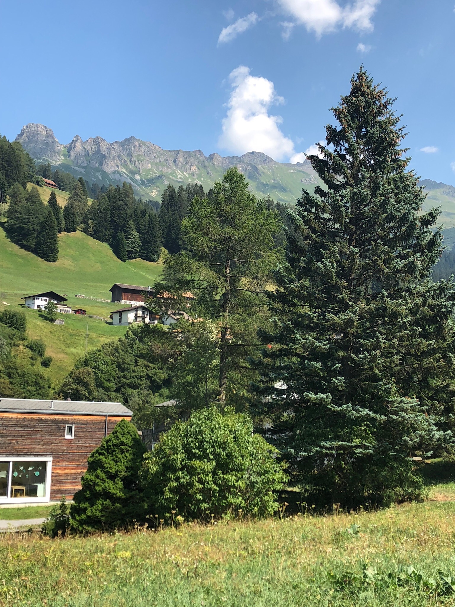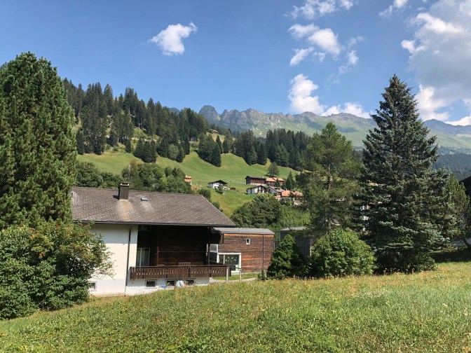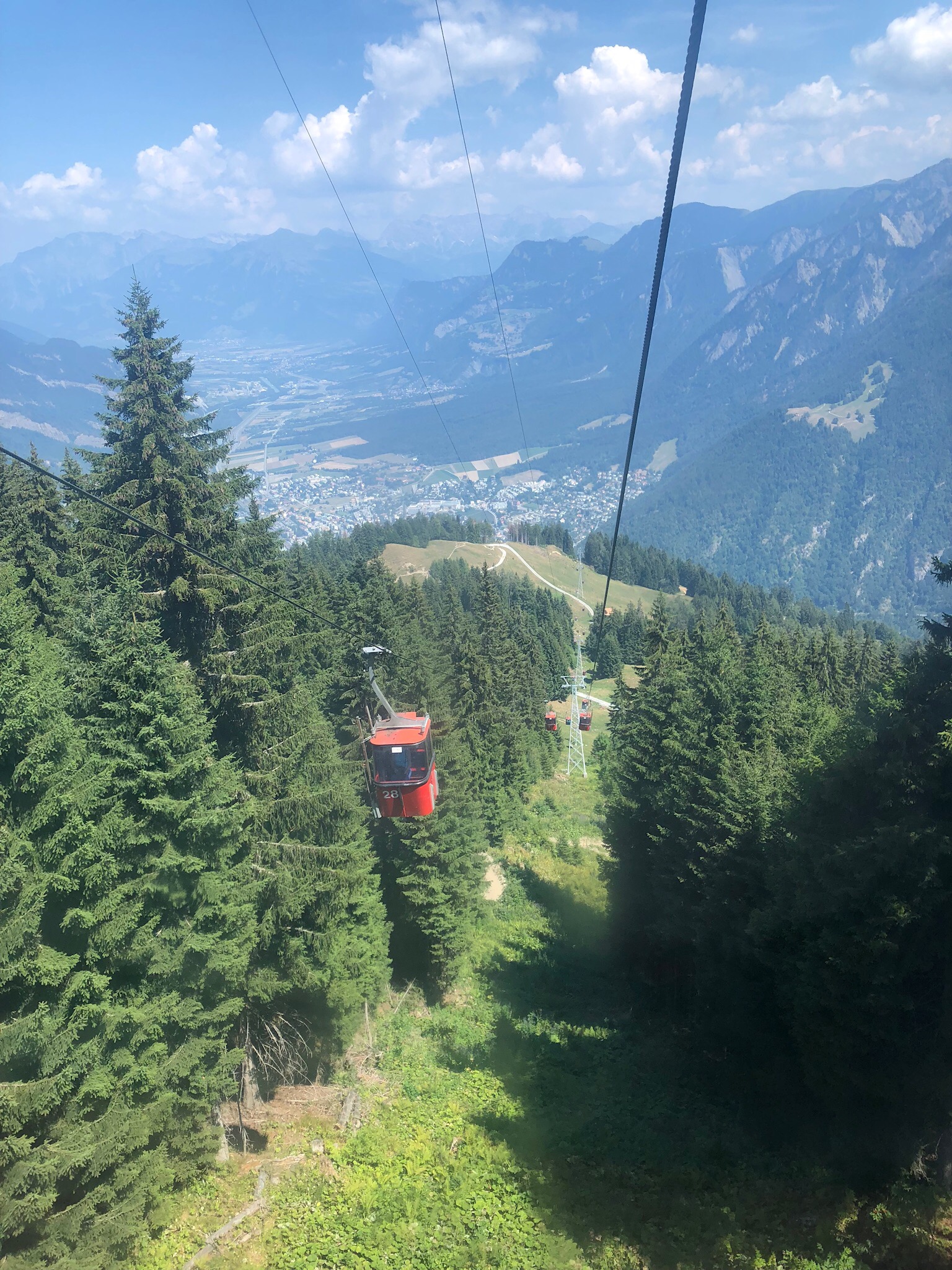 We did manage to find our way to the cable car that goes to the top of Brambrüesch mountain which, at 2174 metres,  is merely a hill the size of Kosciusko. Arriving at the cable car we got in, but it didn’t move, others got in, several loaded their bikes, then got out …no movement…. they all seemed very relaxed…. then at some unseen (to us) signal all got in and off we went. The mountain is apparently a favourite with mountain bike riders and hikers (complete with walking poles and sturdy shoes) and here we are two Aussies in rubber thongs. There doesn’t seem to be any other international tourists in town so I think we are somewhat of a curiosity. And even those who speak English struggle to understand our accent.