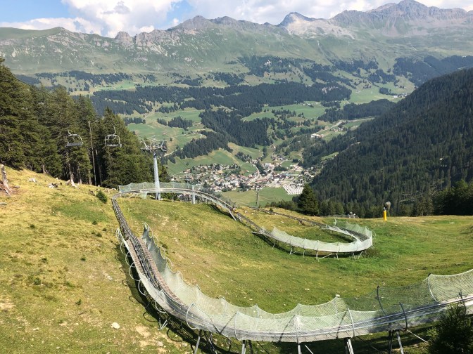 So we conquered one mountain, why not another? We decided to try and find our way to Pradaschier mountain which has the longest toboggan run in Switzerland at a little over 3 KLM’s.  This was a challenge!  There’s a tourist bus that goes around the Alpine towns but there are no signs to the terminal and no obvious place to buy tickets. Not wanting to be beaten we eventually worked it out and were told the chairlift to Pradaschier was the second stop. On the bus there are no announcements of what stop you’re at, no signs on board and several  stops are called Churwalden. We duly got off at the second stop as we had been instructed, wondered briefly why no one else got off, the bus drove off and we realised we were in the middle of nowhere, no chairlift in sight!  We eventually sought help from a woman  tending her garden who, through gestures and sign language, and a brief escort, showed us the way – off we went hiking along the mountain path, in our thongs, in 33 degree heat and eventually arrived noting that the bustop was right next to the chairlift.