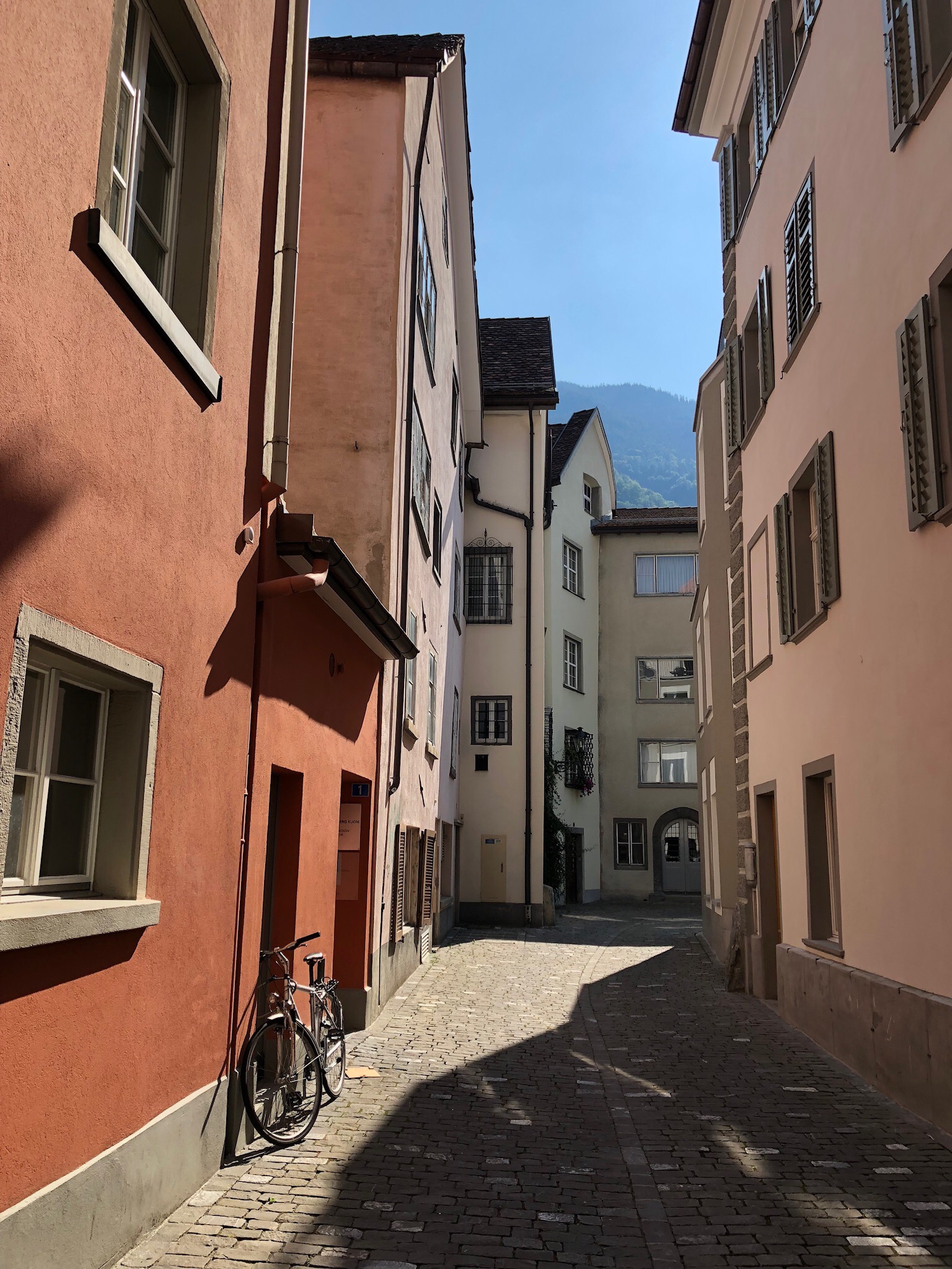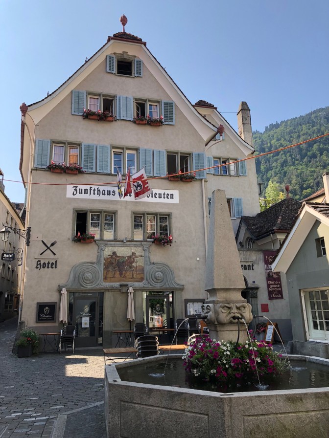 Switzerland and here we are in the Swiss Alps, mountains surround us and we are staying in the heart of the quaint old town of Chur (“coor”). The town is like either a medieval theme park or movie set, it just doesn’t feel real. The hotel we are staying in is a building from the 1300s although it was rebuilt in the 1600s after the town burnt (modern really).