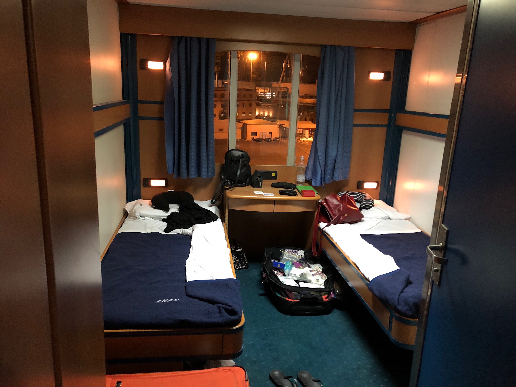 Boarded the ferry and checked into our “first class” cabin.