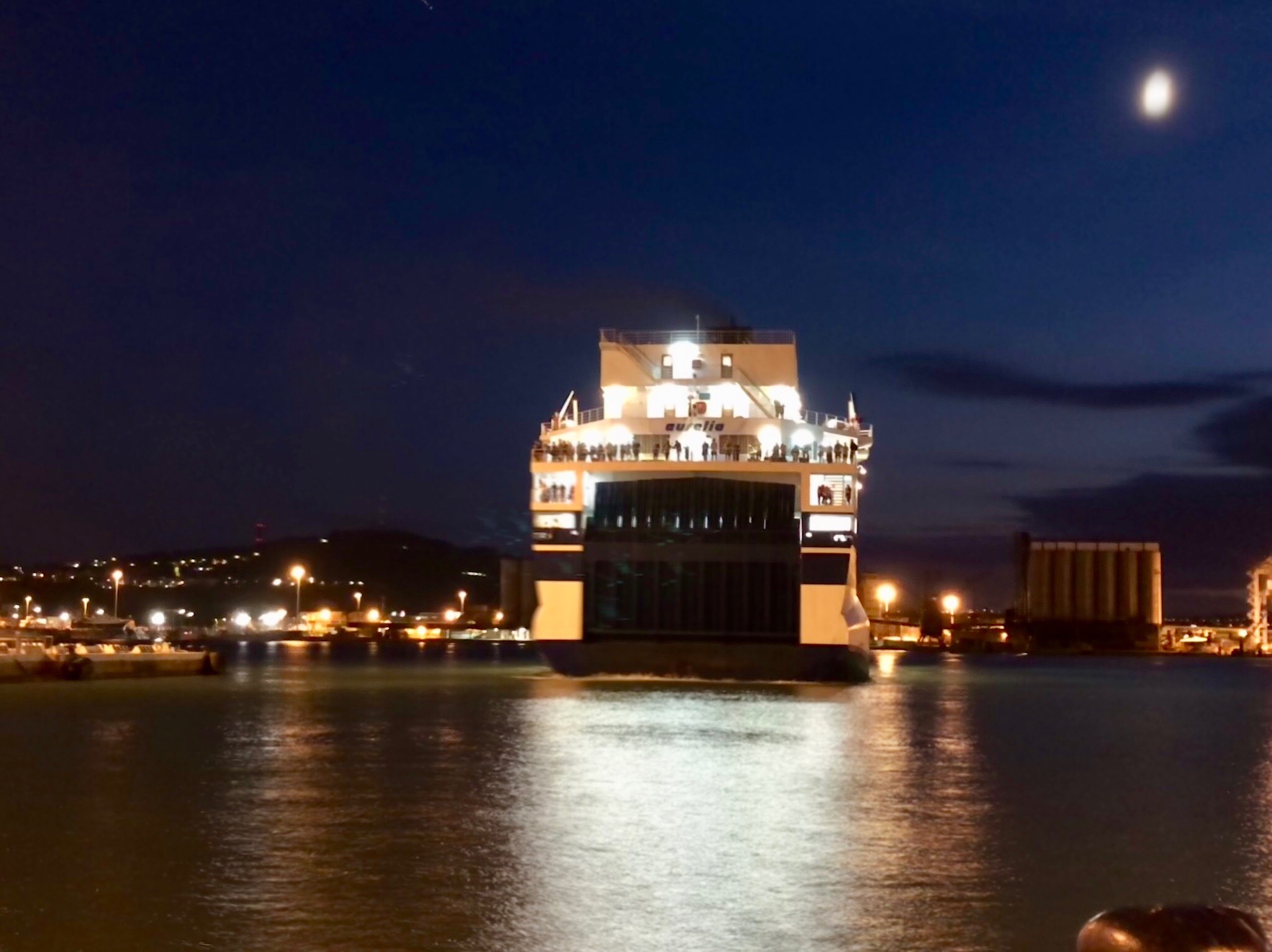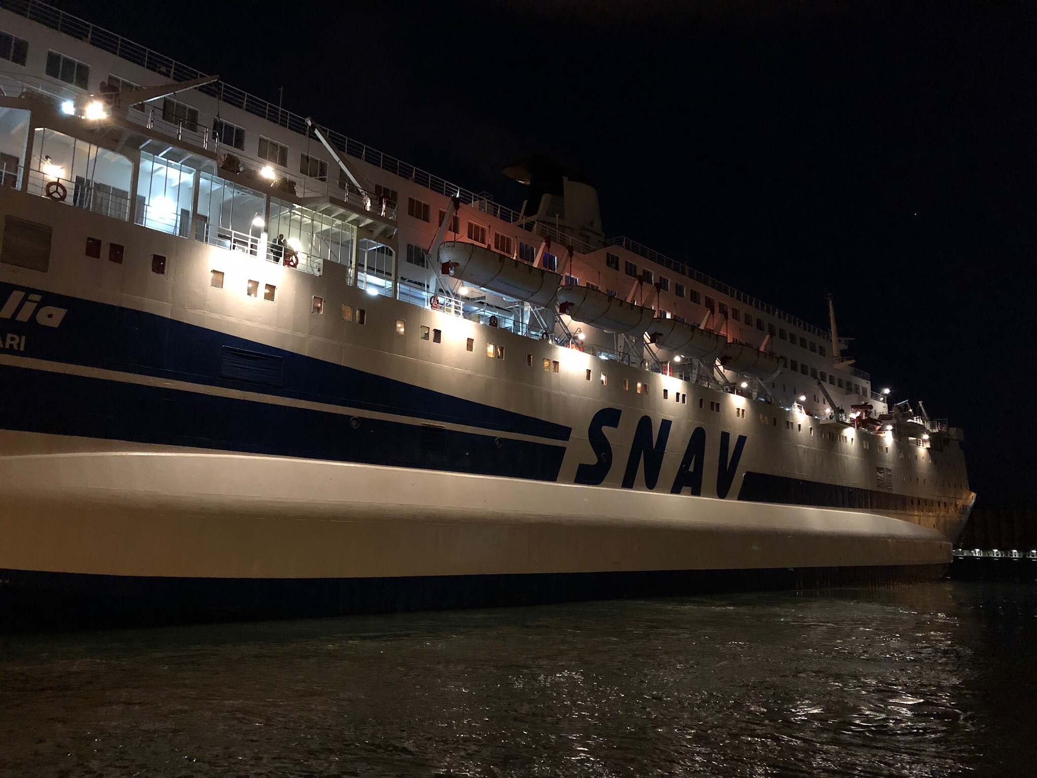 Our two hour train trip stretched to three and a half as it came to a halt multiple times and announcements of delay had us slightly concerned whether we would make our ferry. Eventually arriving we quickly made our way to the ferry terminal, and checked in to be told our ferry would begin boarding at 8:00 pm. At 6.30 we negotiated immigration points and hurried down to the dock and sat on the pier, at 8.00 pm still no sign of the ferry – other companies were coming in and departing but of our ‘Snav’ there was no sign. Eventually around 11:00 pm some lights showed on the horizon and there was a general air of excitement, here it was, at last it’s Snav. By this time we had been sitting on a concrete block at the pier for five hours !